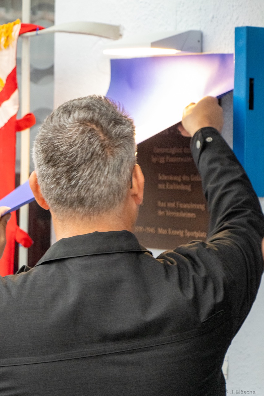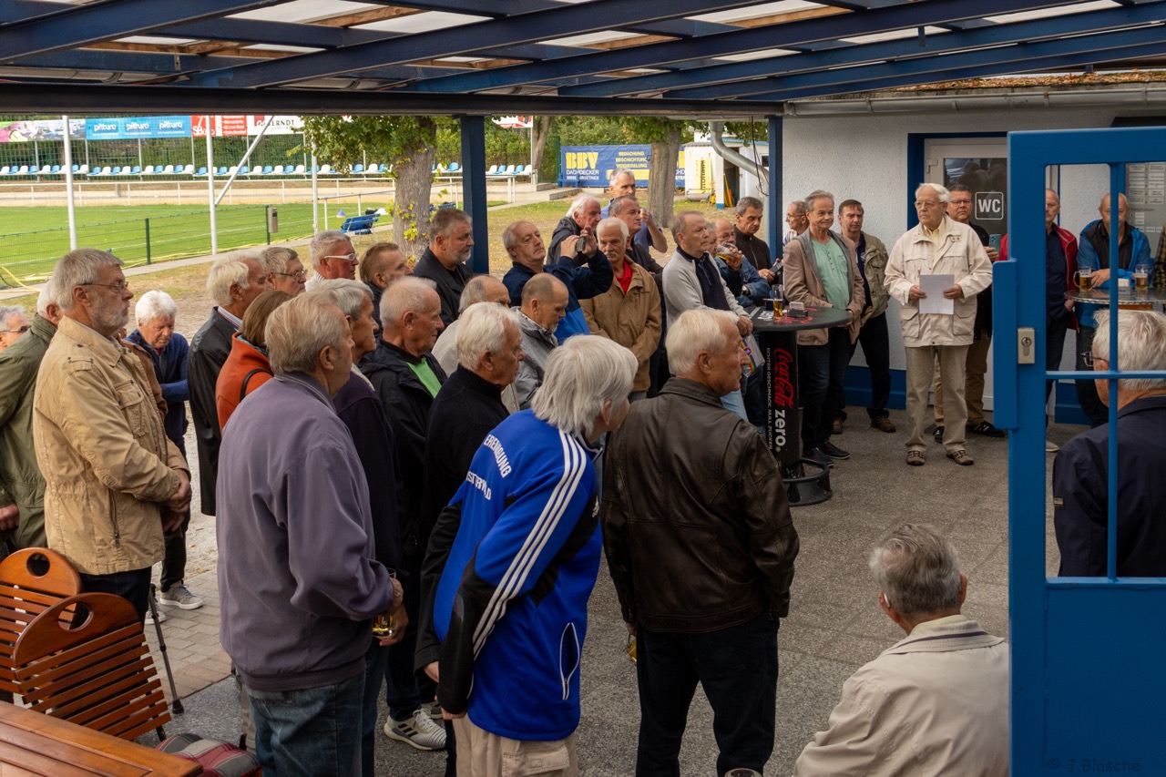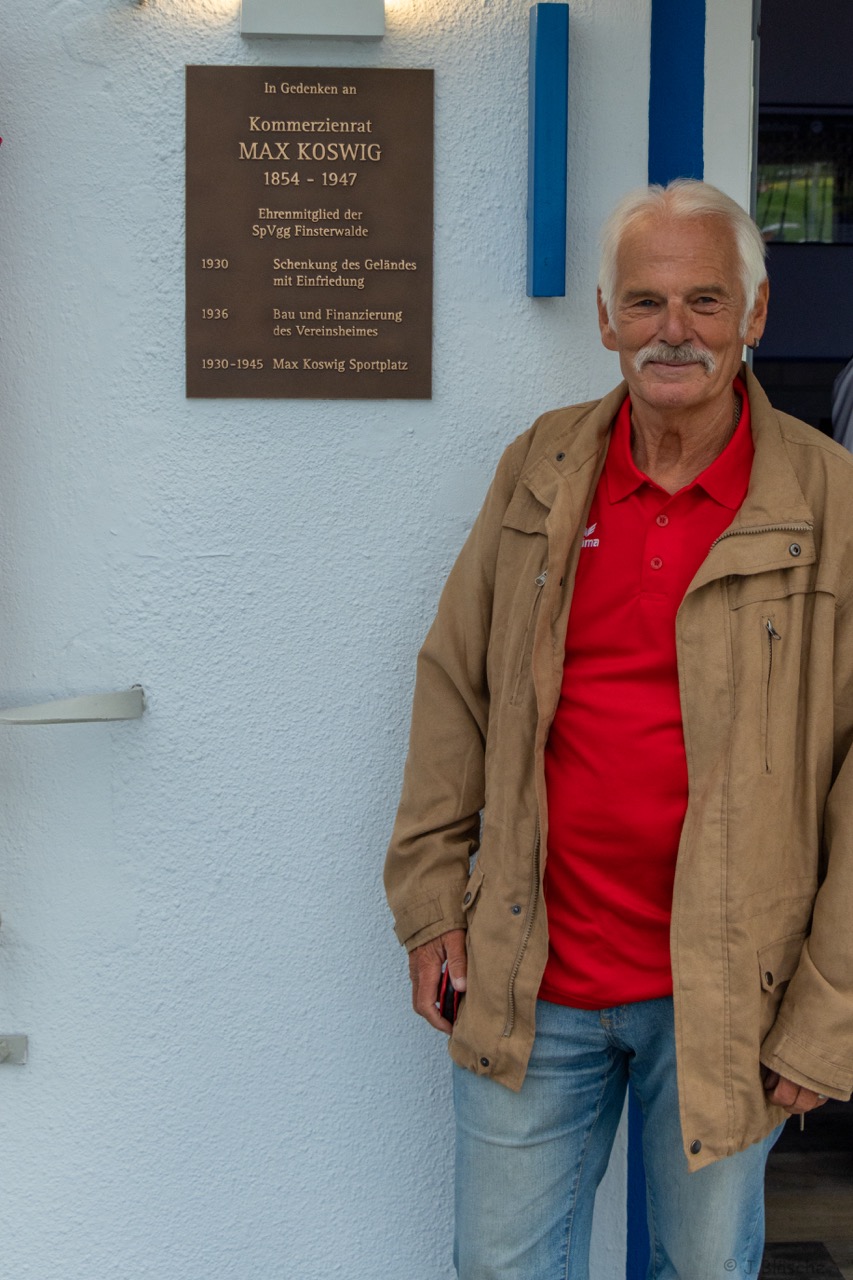 Weit über 60 (!) Fußball-Veteranen der SpVgg bzw. BSG Motor/Ost, mittlerweile aus Nah und Fern, fanden sich am 6. Oktober nachmittags auf der Einheit zum mittlerweile 4. offiziellen Traditionstreffen zusammen. Dieser würdige Rahmen diente dann auch im Beisein der Finsterwalder Sänger und des stellvertretenden Bürgermeisters der Stadt Finsterwalde Frank Zimmermann zur feierlichen Enthüllung und Einweihung der Max Koswig Gedenktafel anlässlich der Stiftung und Schenkung des Sportplatzes mit Vereinsheim in den 30er-Jahren. Unser Ehrenvorsitzende Klaus Mayer und aktueller Vereinsboss Stefan Höhne fanden die richtigen Worte zum Anlass und luden alle Gäste auf ein Fass Freibier ins bestens vorbereitete Vereinsheim ein. Das Team der Vereinsgaststätte sorgte dafür, dass es kulinarisch, ob fest oder flüssig, an nichts fehlte. Zudem gab es viele alte Geschichten, Bilder und auch Lieder, wie die legendäre "Mühle - live" zu erleben.