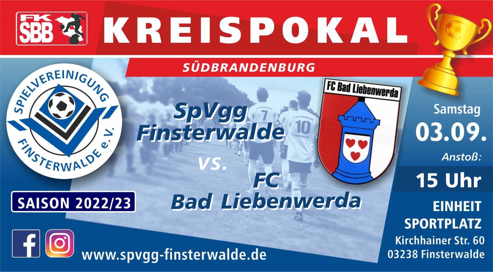 Das wird ein dickes Brett! Am Samstag um 15 Uhr empfängt unsere Erste den FC Bad Liebenwerda zum Kreispokal-Duell um den Einzug in die 2. Runde. Die Kurstädter haben in der Landesklasse Süd einen Sahnestart hingelegt und stehen nach zwei Spielen gemeinsam mit Motor Cottbus-Saspow an der Liga-Spitze. Geleitet wird die Partie von Christian Waschfeld.