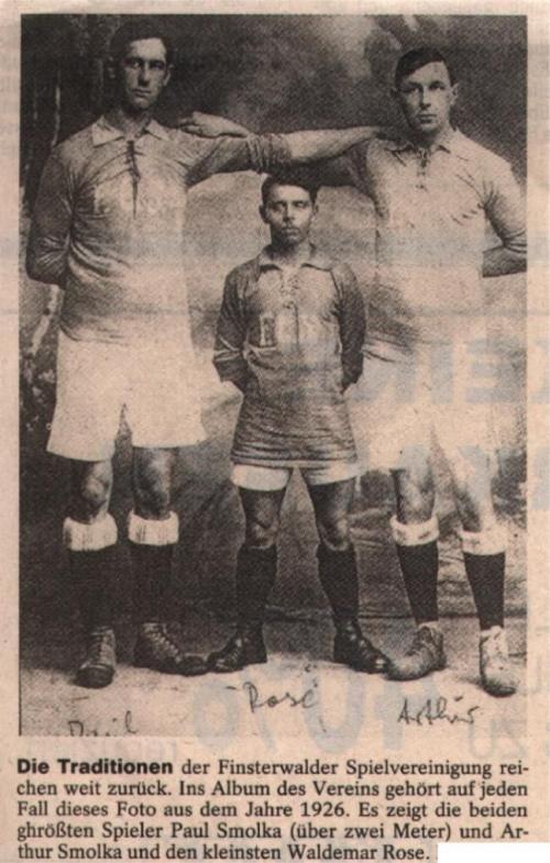 „Die Traditionen der Spielvereinigung Finsterwalde reichen weit zurück. Ins Album des Vereins gehört auf jeden Fall dieses Foto aus dem Jahre 1926. Es zeigt die beiden größten Spieler Paul Smolka (über zwei Meter) und Arthur Smolka und den kleinsten Waldemar Rose.“