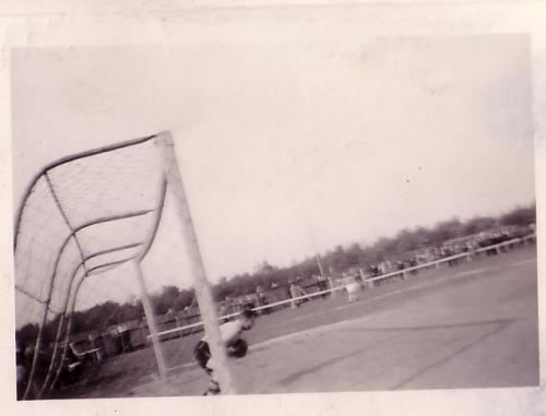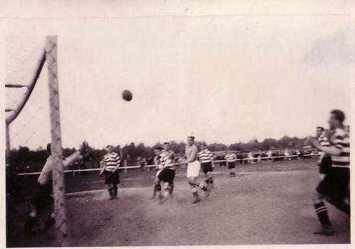 Ganz links der Spieler mit den dicken Stutzen ist Paul Lemanczik. Der größere Spieler vor dem Tor ist Weber von der Spielvereinigung. Die Gastmannschaft ist das Team mit den weißen Ärmeln.