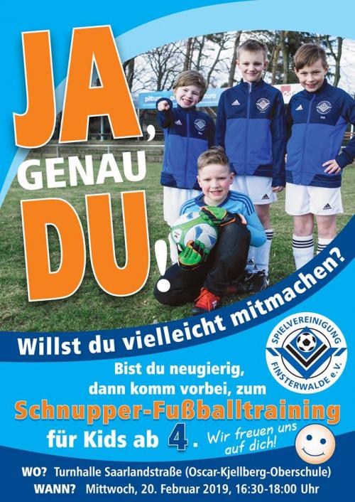 JA, GENAU DU! Unter diesem Motto lädt die Spielvereinigung Finsterwalde alle interessierten Kinder ab 4 Jahre herzlich ein, beim Schnuppertraining in der Sporthalle Saarlandstraße (Oscar-Kjellberg-Oberschule) vorbeizuschauen! Spieler und Trainer der Blau-Weißen erwarten euch für ein gemeinsames Fußballtraining.