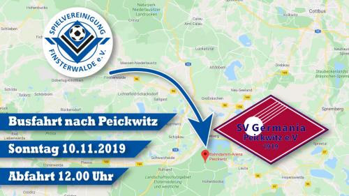 Zum Spiel der 1. Männermannschaft gegen Germania Peickwitz (Sonntag 10.11.2019, Anstoß 14.00 Uhr) steht ein Bus für den reiselustigen Anhang der Spielvereinigung zur Verfügung. Es sind noch Plätze frei!