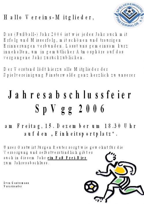 Der Vorstand lädt hierzu alle Mitglieder der Spielvereinigung Finsterwalde ganz herzlich zu unserer Jahresabschlußfeier am Freitag, den 15. Dezember um 18.30 Uhr auf den „Einheitsportplatz“ ein.