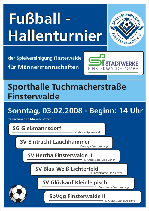 Am kommenden Sonntag (3.2.2008) setzen unsere F1-Junioren die Serie von Hallenturnieren der SpVgg Finsterwalde fort. Beginn ist hier um 10.00 Uhr in der Halle Tuchmacherstraße. Folgende Mannschaften nehmen an diesem Turnier teil: