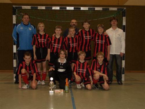 Es begann für unsere Jungs um Betreuer Jens Herzberg recht erfolgreich. Die JSG Am Lausitzring wurde mit 1:0 besiegt und auch Mühlberg im zweiten Spiel hatte das Nachsehen mit 3:0. Im letzten Vorrundenspiel erging es Hoyerswerda nicht viel besser, sie wurden mit 2:0 bezwungen. So hatte man sich souverän für das Halbfinale mit 9 Punkten und 6:0 Toren qualifiziert. Der Gegner hieß hier SV Gröditz 1911. Aber auch in diesem Spiel blieb unsere Mannschaft ohne Gegentor und gewann mit 1:0, wobei Gröditz keine nennenswerte Torchance hatte. Nur der uneinsichtige und teilweise unfaire Trainer der Gröditzer sorgte immer wieder für tumultartige Szenen, als er sogar auf den Unparteiischen Schiedsrichter G. Grünwald losging war den Verantwortlichen klar, das diese Mannschaft nicht mehr eingeladen wird. Aber es ging dann auch sportlich mit dem zweiten Halbfinale weiter. Hier setzte sich die SpVgg Lauchhammer souverän gegen Lausitzring mit 2:0. So standen die beiden besten Mannschaften ohne Gegentor im Finale. Und auch hier wollte sich niemand die Blöße einens Gegentores geben und man spielte 0:0, wobei die Lauchhammeraner klar überlegen waren und sich einige gute Torchancen erspielten. Doch Tom Rösler macht sie alle mit tollen Paraden zu nichte. So mußte der Sieger im Neunmeterschießen ermittelt werden. Auch hier war es Tom, der gleich zwei Neunmeter hielt und damit zum Matchwinner wurde. Herzlichen Glückwunsch zum Sieg ohne Gegentor!!!