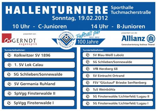 B-Junioren: So. 14:00 Uhr Eigenes Hallenturnier (Sporthalle Tuchmacherstraße) 2. Platz (I.) und 5. Platz (II.)