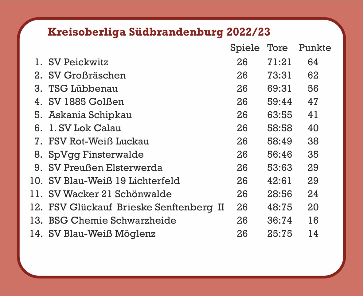 die Saison 2022/23 zeigte zwei Gesichter der 1. Männermannschaft, nach schwachem Start konnte man erst am 13. Spieltag die Abstiegsplätze verlassen und nach dürftigen 7 Punkten in der Hinrunde, holte sich das Team von Trainerduo Smolka/Kusno noch 28 Punkte! - die erfolgreichsten Torschützen: Cornel Böhme 9 Tore, Jens Rösler 8, Olli Bossing 6, Christoph Kowalewski und Oskar Weinert 5 Tore, Tom Plewka 4
