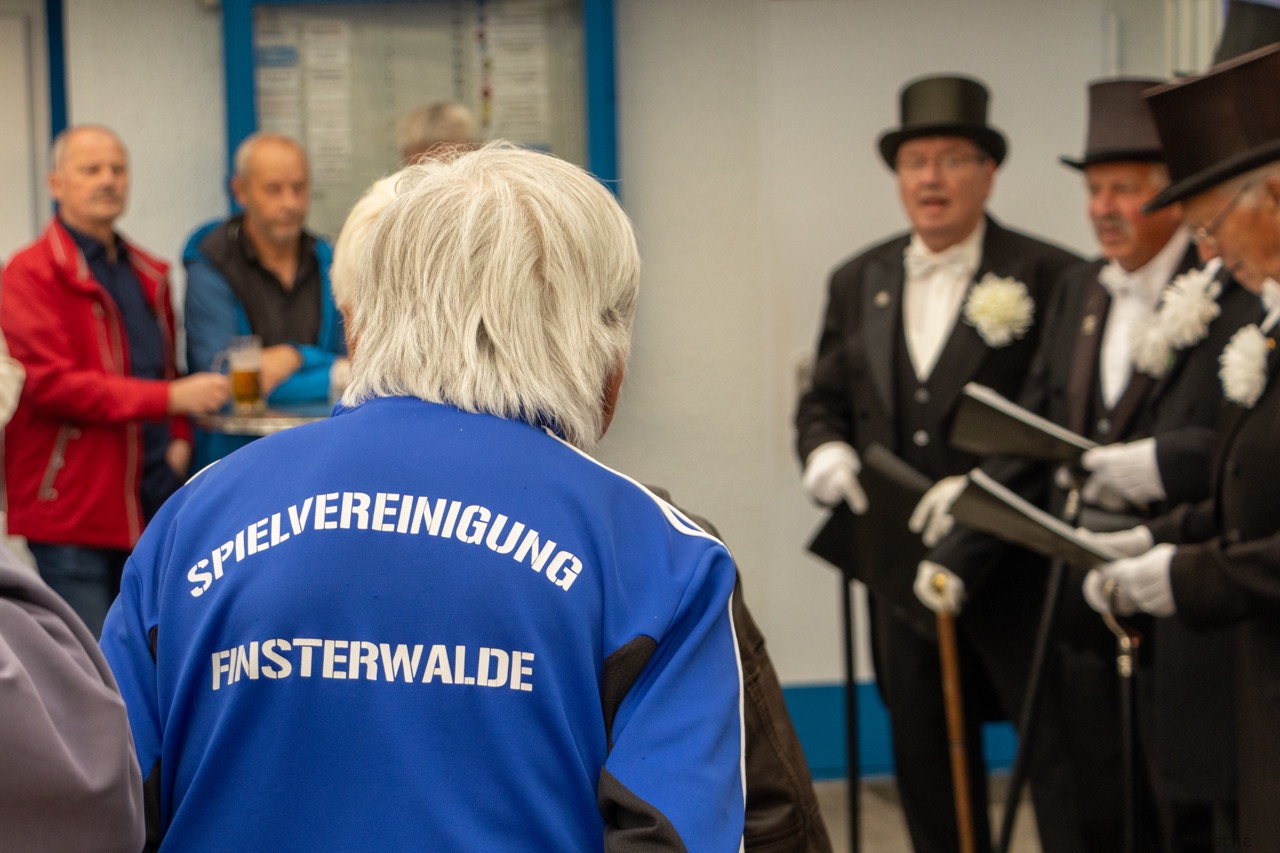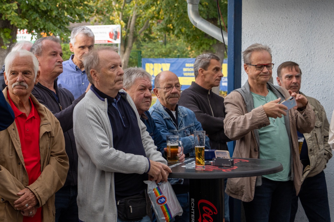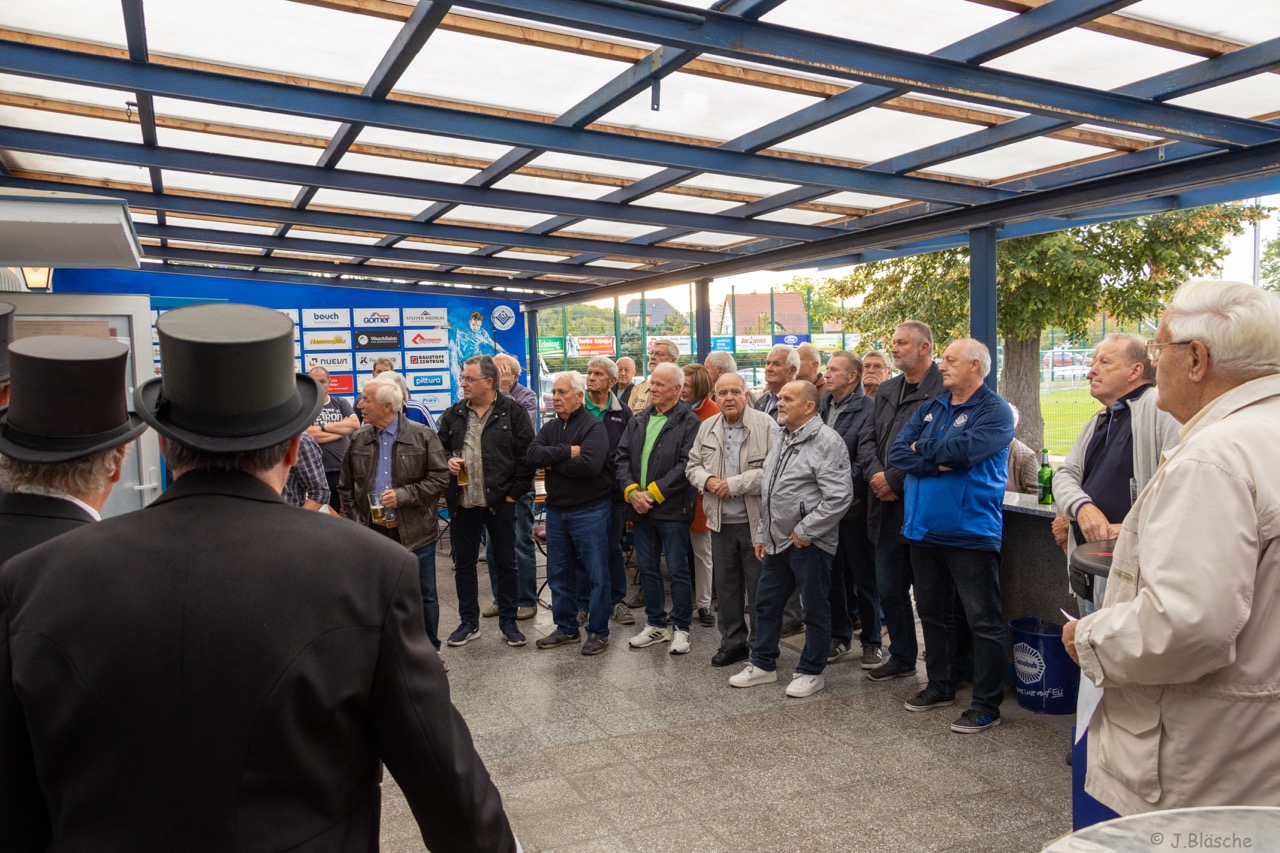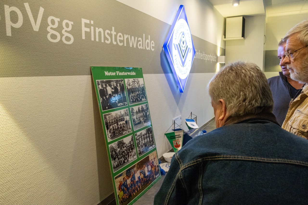 Weit über 60 (!) Fußball-Veteranen der SpVgg bzw. BSG Motor/Ost, mittlerweile aus Nah und Fern, fanden sich am 6. Oktober nachmittags auf der Einheit zum mittlerweile 4. offiziellen Traditionstreffen zusammen. Dieser würdige Rahmen diente dann auch im Beisein der Finsterwalder Sänger und des stellvertretenden Bürgermeisters der Stadt Finsterwalde Frank Zimmermann zur feierlichen Enthüllung und Einweihung der Max Koswig Gedenktafel anlässlich der Stiftung und Schenkung des Sportplatzes mit Vereinsheim in den 30er-Jahren. Unser Ehrenvorsitzende Klaus Mayer und aktueller Vereinsboss Stefan Höhne fanden die richtigen Worte zum Anlass und luden alle Gäste auf ein Fass Freibier ins bestens vorbereitete Vereinsheim ein. Das Team der Vereinsgaststätte sorgte dafür, dass es kulinarisch, ob fest oder flüssig, an nichts fehlte. Zudem gab es viele alte Geschichten, Bilder und auch Lieder, wie die legendäre "Mühle - live" zu erleben.