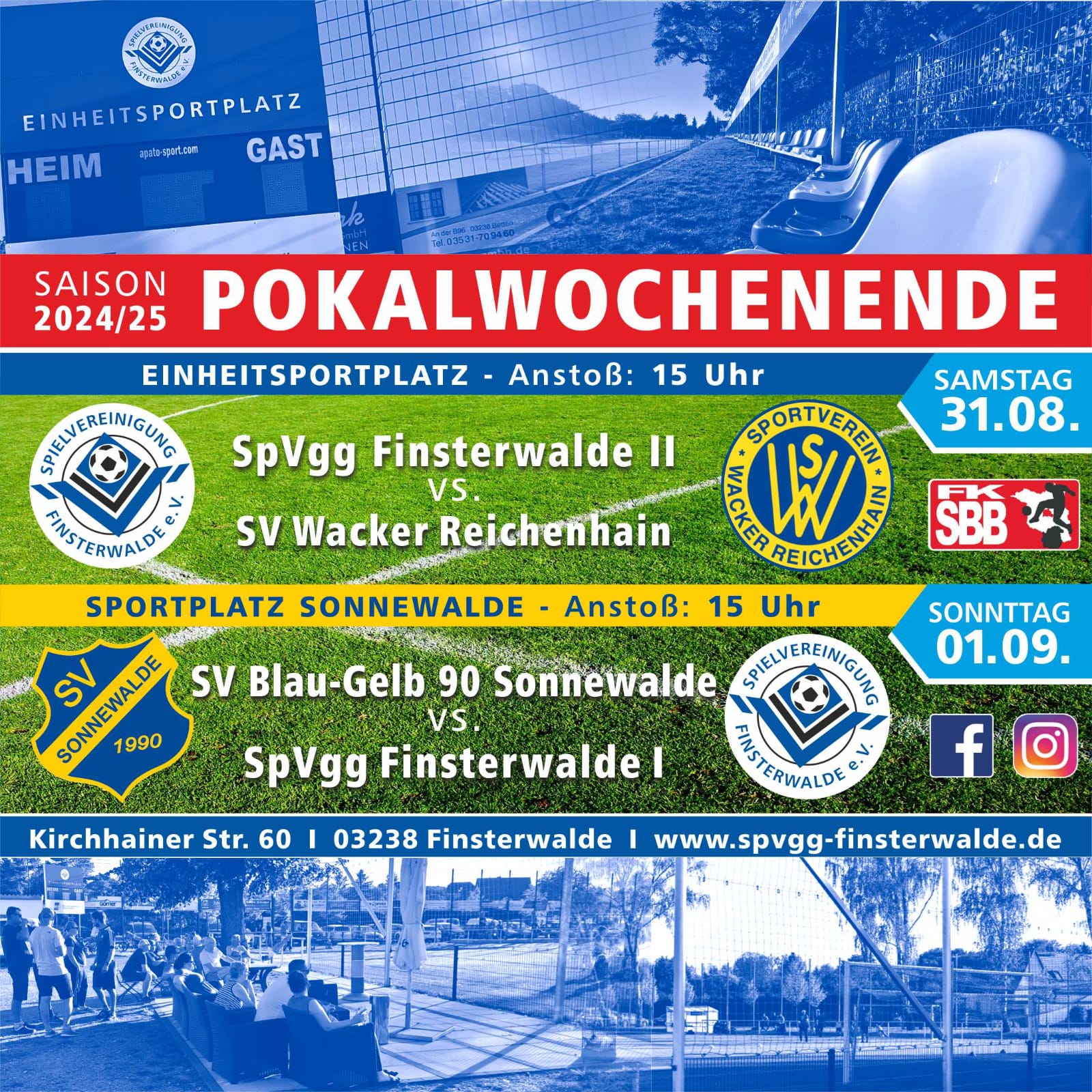 Nach dem Sängerfest ist vor dem großen Pokalwochenende für unsere Männermannschaften. Einmal dahoam und einmal fast. Beide Male im Südbrandenburg-Pokal. Am Samstag geht es für unsere Südbrandenburg-Cup-Champions auf der Einheit um den Einzug in die Runde der Top 16. Gegner für unsere Zwote ab 15 Uhr ist der SV Wacker Reichenhain (Kreisliga West). Ein spannendes Duell ist ziemlich sicher.