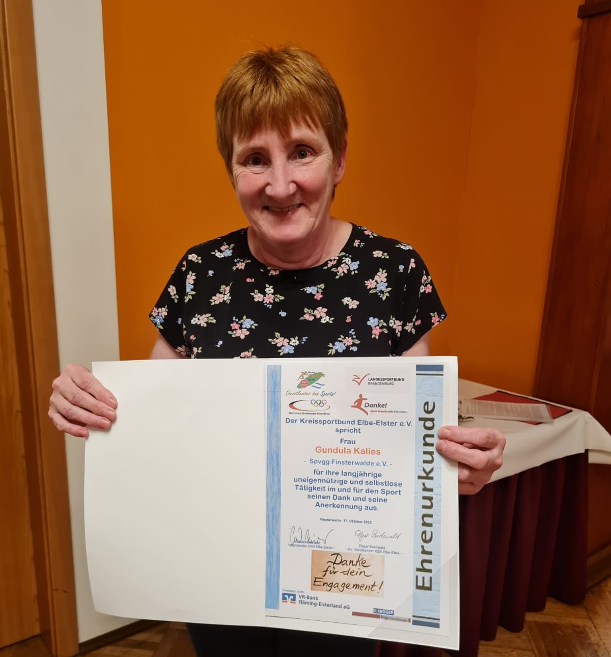 Nicht nur wir sagen „Danke, liebe Gundula, für diesen großartigen Einsatz!“, sondern auch der Kreissportbund Elbe-Elster – mit der gerade überreichten Ehrenamtsurkunde bei einer Auszeichnungsveranstaltung in der Gaststätte Alt Nauendorf. Wir hoffen, dass Gundula noch lange mit unseren Trikots um die Wäsche strahlt.