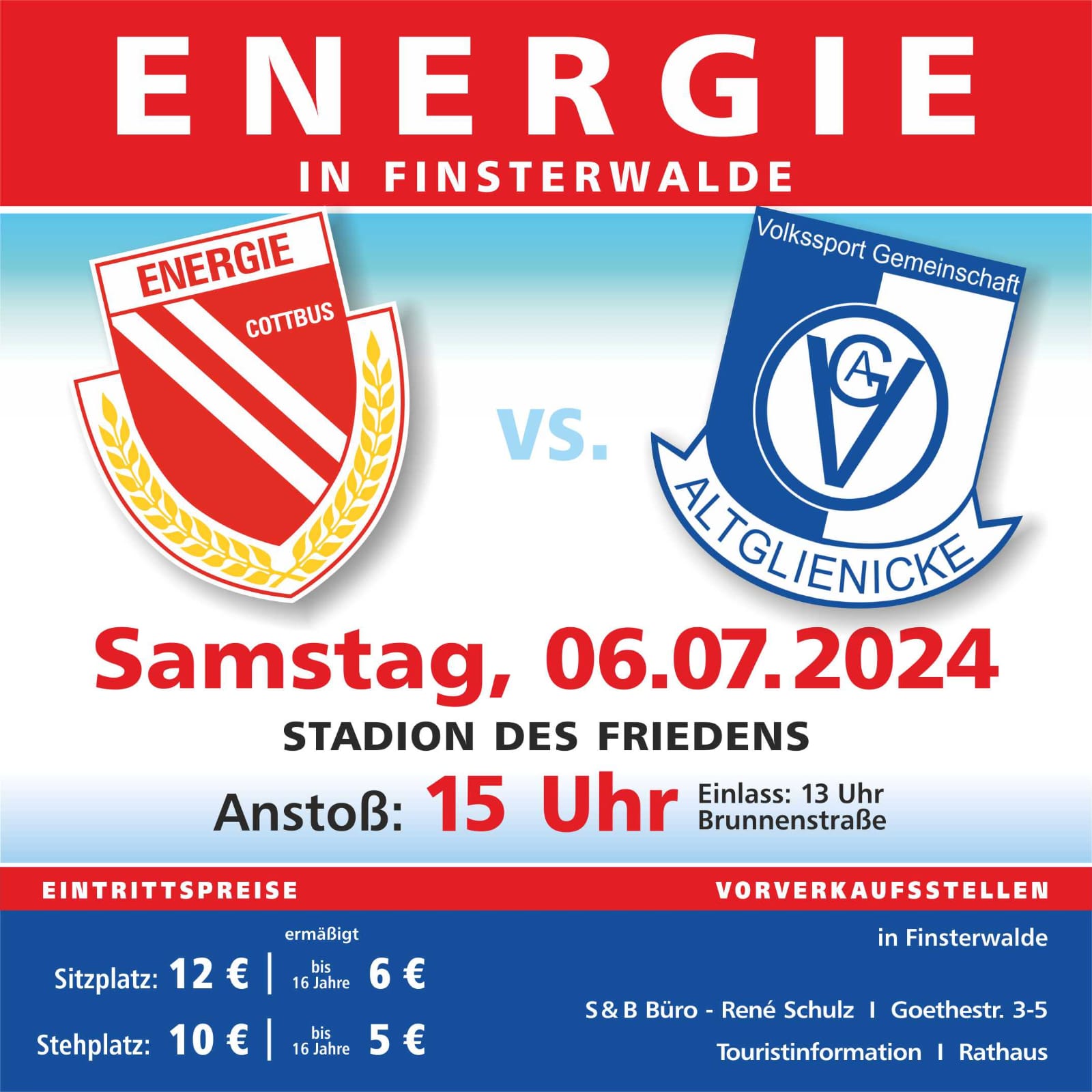 Der Vorverkauf für das Spiel beginnt bereits am Montag, 24. Juni. Eintrittskarten sind bei S&B Büro – René Schulz in der Goethestraße sowie in der Touristinformation im Finsterwalder Rathaus zu den jeweiligen Öffnungszeiten erhältlich. Am Spieltag selbst sind die Kassen an der Brunnenstraße ab 13 Uhr geöffnet.