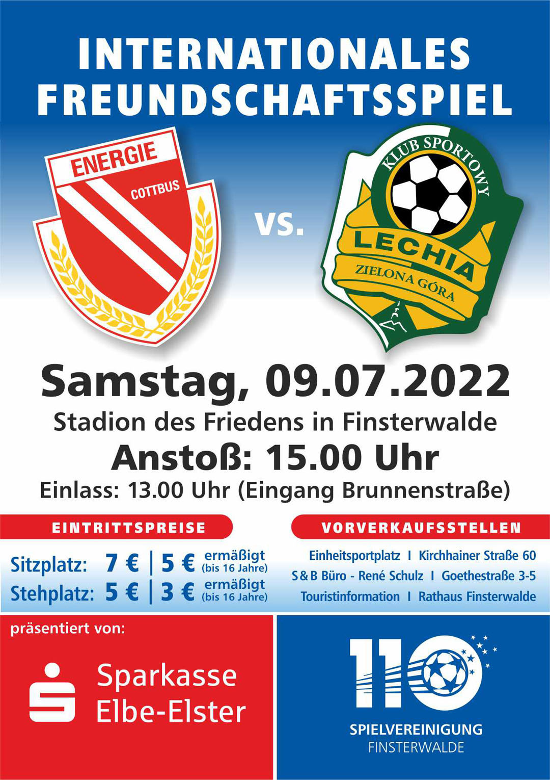 das ist längst keine Überraschung mehr: Der FC Energie Cottbus reist am Samstag, 9. Juli, im Stadion des Friedens an, um nach unserer Einladung und vor allem dank unseres starken Partners Sparkasse Elbe-Elster ein Testspiel für die Saisonvorbereitung vor den FCE-Fans in Finsterwalde zu absolvieren. Zu Gast ist der polnische Drittligist Lechia Zielona Gora. Anstoß ist um 15 Uhr, der Einlass startet 13 Uhr. Der Zutritt zum Fußball-Spaß mit der Wollitz-Elf erfolgt über den Eingang Brunnenstraße.